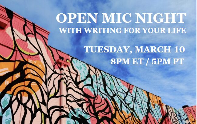 - Everyone is welcome! You do not need to read your work to participate. There will be opportunities during the event to dialogue and give feedback to speakers in a safe and supportive environment. This is a wonderful way to meet and connect with others in the Writing for Your Life community.